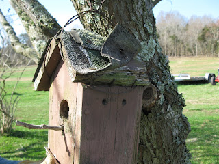 There is a bluebird house in one of the old apple trees. Son-in-law M. advised that one must clear out the old nest before the birds can move in. Sure enough, this morning there was increased activity around the little structure. I can imagine Mother Bluebird having peered in yesterday and stating flat out that she wasn't going to houseclean someone else's muddle before taking up residence.