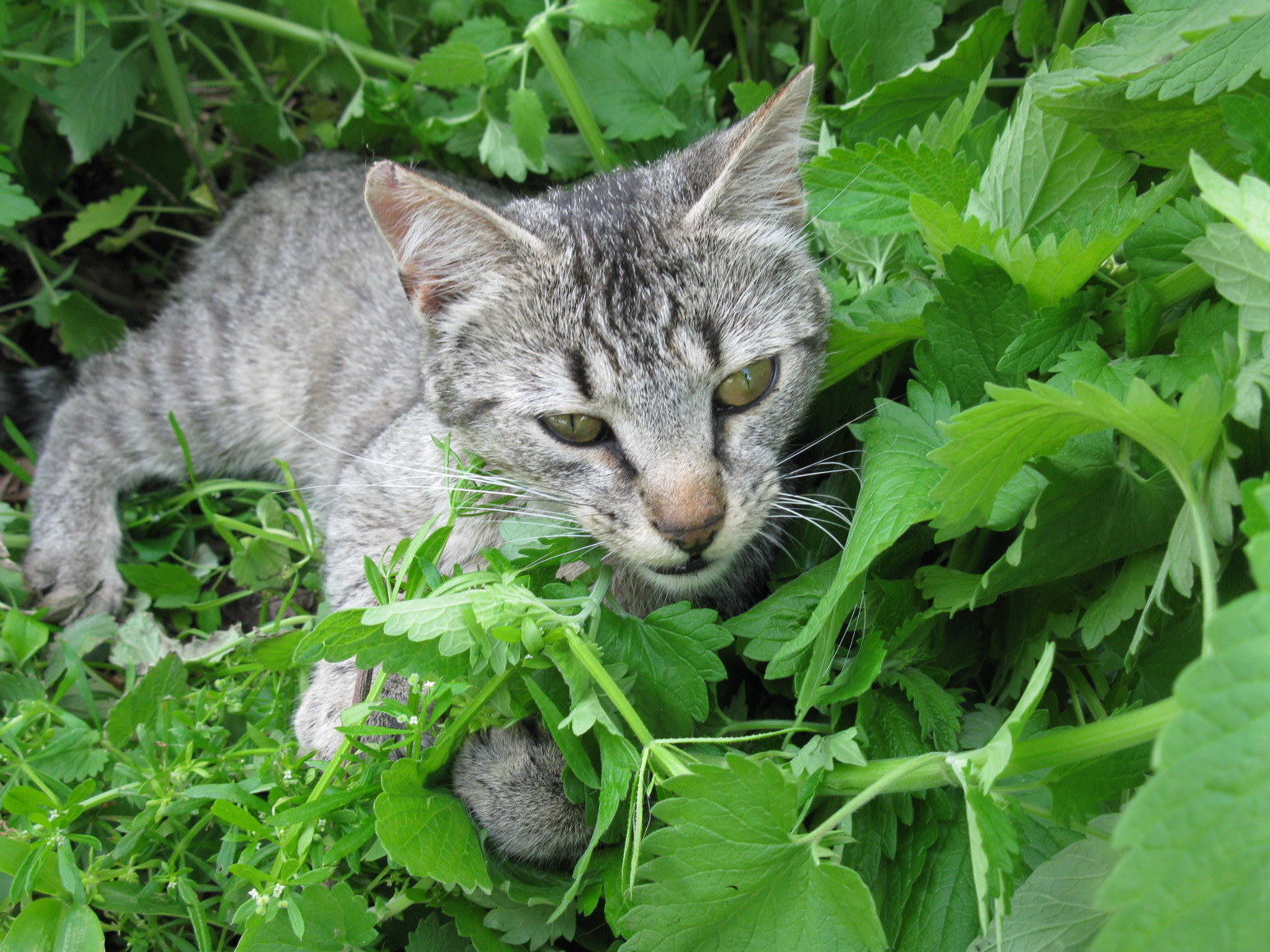 Friday morning after helping J. in the garden, he strolled back to the house and flung himself into the patch of catnip [nepeta cataria.]